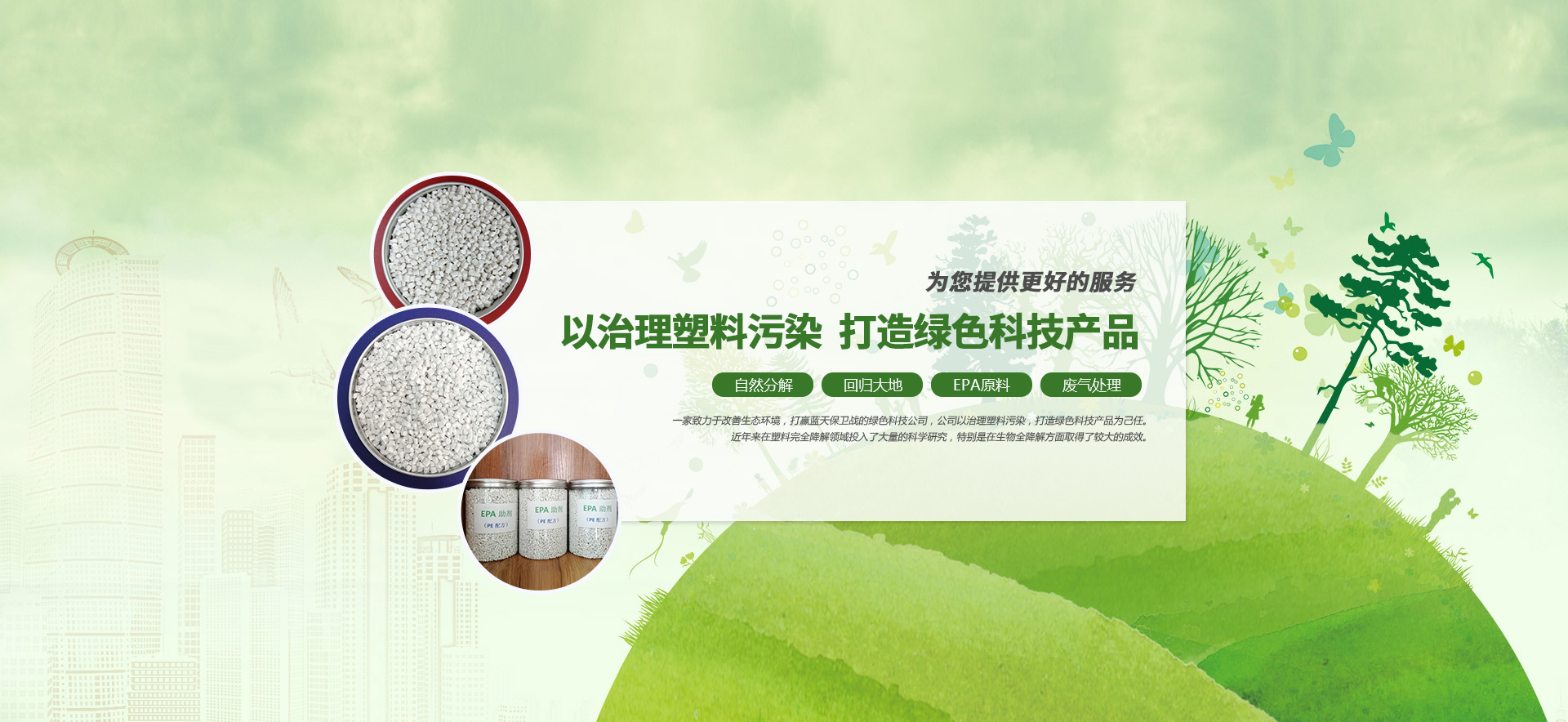 是一家集環保科技產品的研發、制造、銷售、貿易及技術指導為一體的環??萍计髽I公司,研究的產品“塑料生物降解劑(功能性母料)”、“生物降解添加顆粒”及使用添加“生物降解添加顆?!焙笏a的可降解塑料產品,得到德國萊茵檢測、SGS 歐盟 REACH 檢測、國塑檢測等國內外多家權威機構的檢測與認證